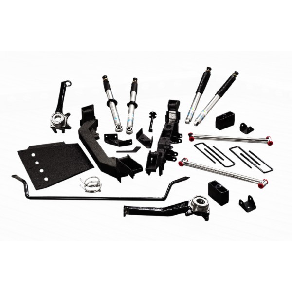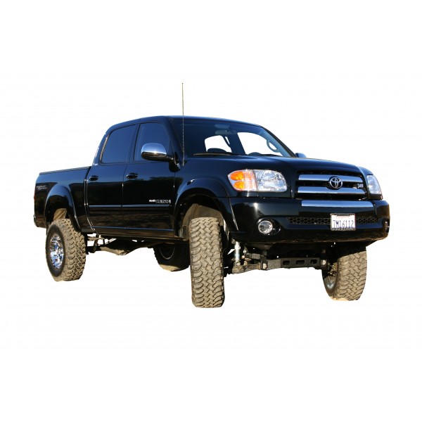 The RCD 6" Suspension System for the 2000 - 2003 [August] Toyota Tundra 2WD / 4WD includes: CNC Machined Replacement Cast Iron Steering Knuckles for Precise Steering Geometry, Heavy Duty Two Piece Lower Sub-Frame Cross Members that are Precision Formed from 1/4" Thick Plate Steel Insuring Structural Strength and Durability, polished 304 Stainless Steel "Twin-Link" Anti-Compression Struts Provide Additional Support and Exceptional Support. Replacement Bilstein 5100 Series Coil-Over Front Shocks for Superior Handling and Ride Characteristics. RCD "Gator Black" Polyurethane Powder Coat Finish for Lasting Good Looks. Grade 8 Hardware for Reliability. Steel Braided Front Brake Lines for Correct Length and Increased Braking Performance. Replacement Heavy Duty Front Sway Bar for Added Performance and Stability. Custom Matched Bilstein 5100 Series Monotube Gas Pressure Front & Rear Shocks.