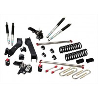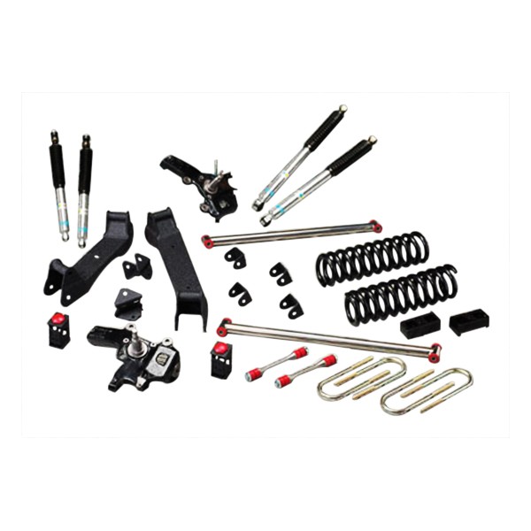 1997-2003 6" Suspension System - Ford F150 2WD features: CNC machined replacement cast iron steering knuckles, Heavy duty one piece differential skid plate, Machined aluminum front driveline and axle hardware, Factory style rear block and U-bolt assembly (no "Stacking" of blocks), Custom tuned front ride height adjustable Bilstein monotube gas pressure shocks that feature: A 4.5" or 6" ride height can be selected upon installation and High quality factory style mounting hardware that assures trouble free performance on these load bearing shock assemblies.