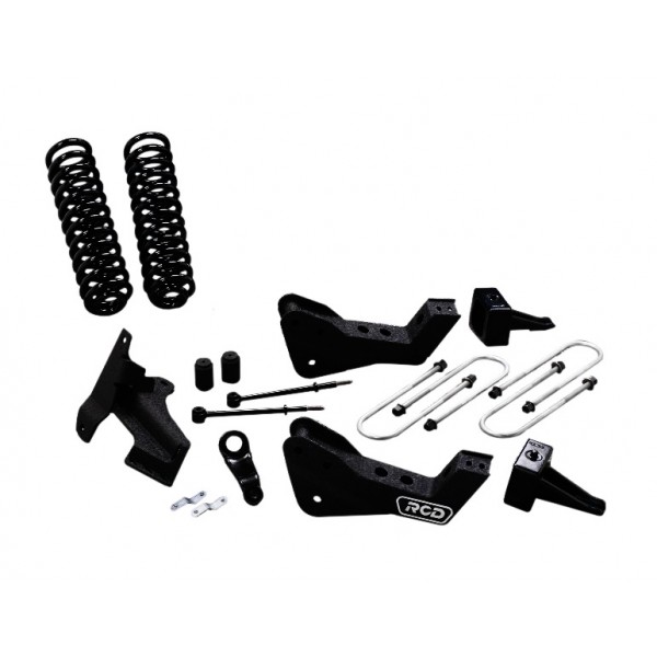 The RCD 4" Suspension System for the 2005 - 2007 Ford F250 / 350 8-Lug, 4WD includes: Progressive rate coil springs made from high quality U.S. spring steel, providing long life, and superior ride characteristics; Fox Performance Series shock absorbers; heavy duty 1/4" thick mounting brackets provide enhanced strength and alignment characteristics; 3/8" plate steel extreme duty track bar drop bracket eliminates bump steer and provides the ultimate in strength and durabilit; forged steel drop pitman arm maintains precise steering geometry; extended sway bar links provide factory mounting locations and proper sway bar function; stainless steel extended front brake lines; and unique "Gator Black" polyurethane powder coat finish.