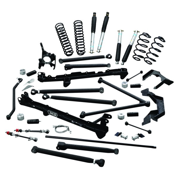 The RCD 6"" Long Arm Suspension System for the 1997 - 2006 Jeep TJ includes: Extended Length Upper and Lower Arms Featuring: Precision machined, replacement passenger side steering knuckle and heavy duty tie rod assembly eliminates the factory ""Y Link"" style steering set-up; rear lower and upper links increases flexion ability; sway bar end links assembly for a smooth and unbinding operation and problem free alignment; heavy duty adjustable front track bar assembly insures increased strength and problem free alignments; and four custom matched Bilstein Monotube Gas Pressure shocks for maximum performance and ride characteristics. Tremendous off road performance combined with defined, pleasant street handling make this an exceptional option for this suspension system. "