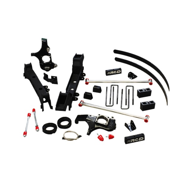 The RCD 6"" Suspension System for the 1999-2011 Chevy/GMC 8-lug, 1500, 2500 (Non HD) & 2500 Avalanche, Yukon, & Suburban, 2WD & 4WD, Standard Torsion Bar Suspension (Non Delphi Auto) (*1500HD 01-06 models only) includes: CNC machined replacement cast iron steering knuckles, T-6 billet aluminum axle spacers, zinc plated billet steel ""Super-Flex"" sway bar end links, replacement heavy duty lower link arms, rear coil spring, shock absorber relocation bracketry, Bisltein 5100 Series Shock Absorbers. Note: no drive shaft modifications are needed for installation."