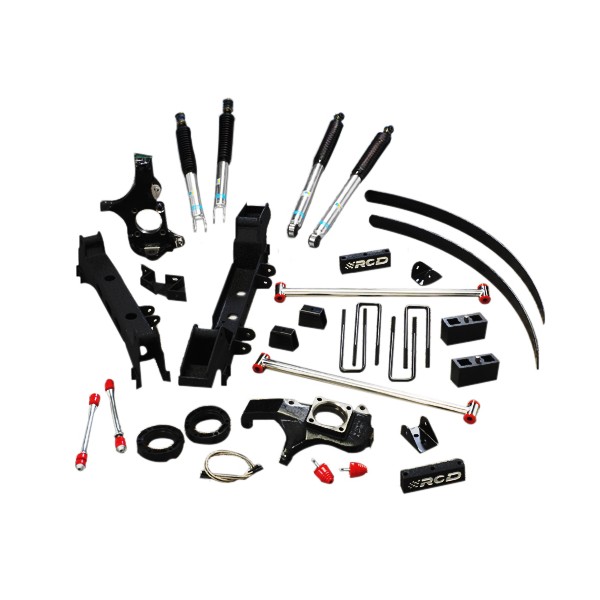 The RCD 6" Suspension System for the 1988 - 2000 Chevy/GMC 8-lug, 2500, 3500 (Single Rear Wheel) K Series Pick Up & Suburban, 4WD, Standard Torsion Bar Suspension (*K Series Old Body Style Only) includes: CNC machined replacement cast iron steering knuckles, T-6 billet aluminum axle spacers, zinc plated billet steel "Super-Flex" sway bar end links, replacement heavy duty lower link arms, rear coil spring, shock absorber relocation bracketry, and Bisltein 5100 Series Shock Absorbers. Note: no drive shaft modifications are needed for installation