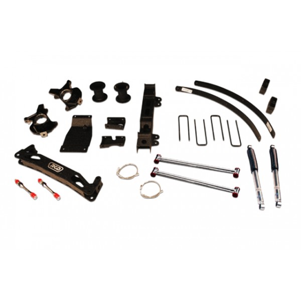 The RCD 6"" Suspension System for the 2007-2013 Chevy/GMC 6-lug, 1500 $WD, Strut Style Suspension System includes: CNC machined replacement cast iron steering knuckles, T-6 billet aluminum axle spacers, zinc plated billet steel ""Super-Flex"" sway bar end links, replacement heavy duty lower link arms, rear coil spring, shock absorber relocation bracketry, and Bisltein 5100 Series Shock Absorbers. Note: no drive shaft modifications are needed for installation."