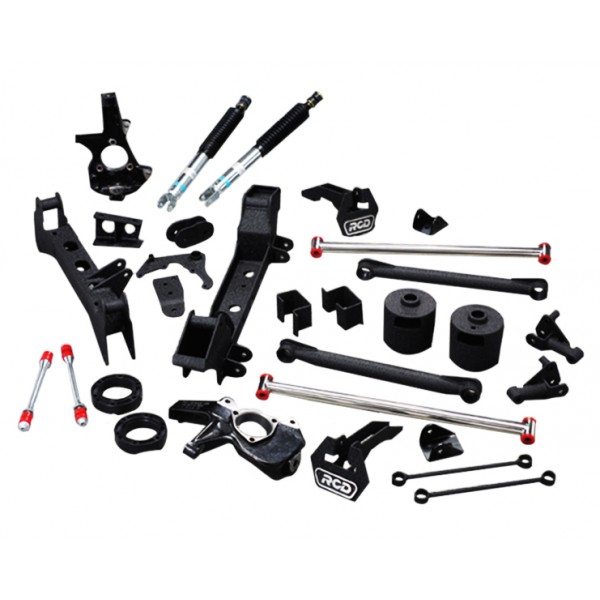 The RCD 6" Suspension System for the 2000 -2006 Chevy/GMC 2500HD 8-lug, 2WD includes Bilstein 5100 series Shock Absorbers, CNC machined replacement cast iron steering knuckles, T-6 billet aluminum axle spacers, zinc plated billet steel "Super-Flex" sway bar end links, replacement heavy duty lower link arms, rear coil spring, pan-hard bar, shock absorber relocation bracketry, and Bisltein 5100 Series Shock Absorbers. Note: no drive shaft modifications are needed for installation.