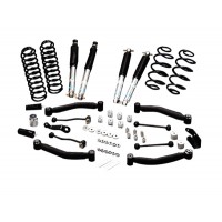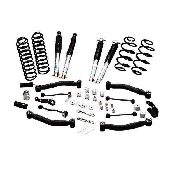Lower control arms with RCD Flex Joints, 4" lift coils, Bilstein 5100 series shocks, trac-bar relocation brackets, extended sway bar links and extended bump stops. Maximum articulation and off road handling are achieved through the combination of RCD's flex joint control arms and tuned Bilstein 5100 shocks. On road, the factory handling is retained using precisely engineered coil springs and corrected driveline angles.